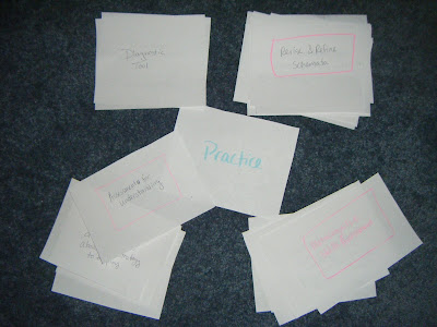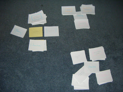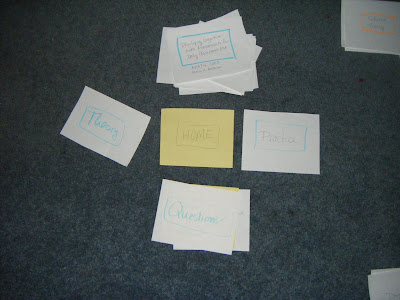 You might find this odd, but when I go to design a new digital presentation, I start on paper. I began this presentation with about a hundred quarter-sheets of paper, each with a key phrase, main idea, supporting idea, or statement. I first try to organize these into some kind of cohesive structure – here’s what my first attempt looked like:
