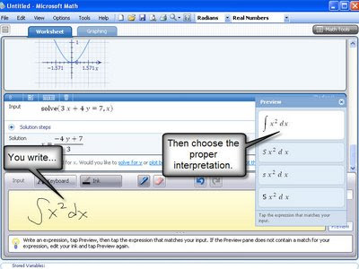Eleven months ago, I discovered a little-known program called Microsoft Math (read old post here). This was the first decent attempt that I’d seen at handwriting recognition for math. I’m guessing that Microsoft Math was the testing ground for a new feature that will be released with Microsoft’s Windows 7 – handwriting recognition for math (see Gizmodo post for more Windows 7 spoilers). You can see similarity in the screenshots of the Microsoft Math interface and the image that has been posted for Windows 7.