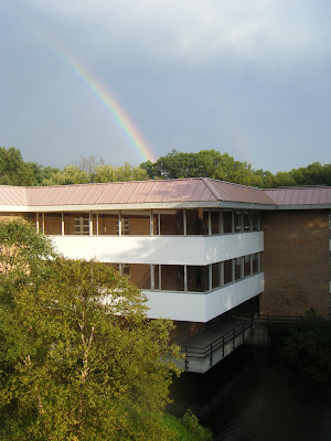 Then I realized that I could get a much better shot of the rainbows over the central part of campus, so I grabbed all my stuff and ran around the building to take some photos on the more scenic side (again abandoning all my stuff under another overhang). Good thing too, because it only lasted about 3 minutes.