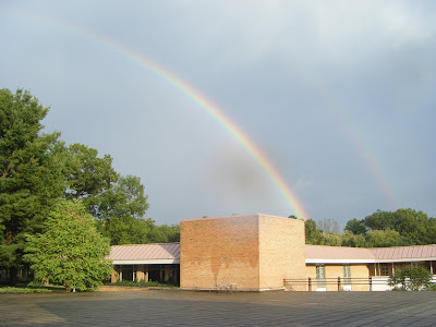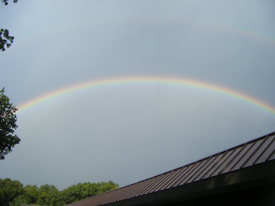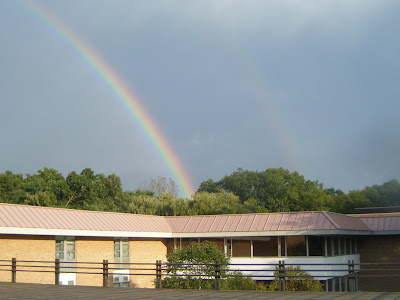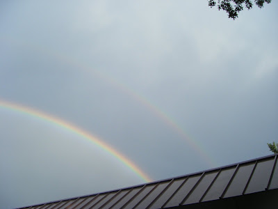 I always carry this little $100 Fuji camera that slips into my purse and takes reasonably good pictures, so I dropped everything I was carrying under the overhang of the building (it had started raining), grabbed my camera, and began taking photos of what turned out to be a beautiful double rainbow.