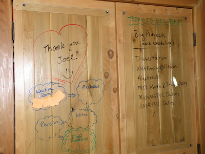 Now that I’m in “sabbatical” mode, I finally have time to think about things I’ve been meaning to do for weeks months years. Many of those things relate to organization, project planning, and creativity (freeing up your mind to be creative instead of dealing with details). Here’s the first of the new additions to my “sanity protection” – a whiteboard, only not white!